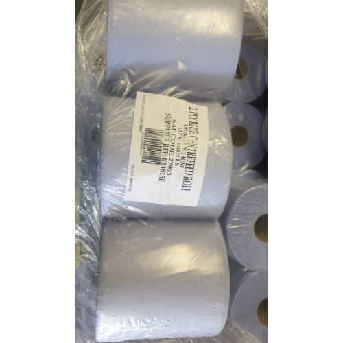 2 ply blue centre filled roll, 180mm x 130 metres. 6 rolls to pack