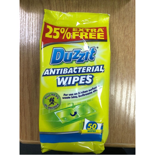 50 x antibacterial wipes for use on kitchen surfaces, waste bins, bathrooms etc. Kills 99.9% of bacteria