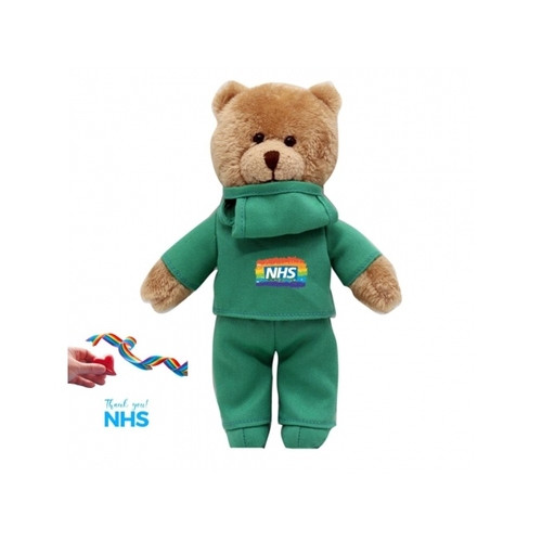 Doctor / surgeon teddy bear, comes with matching teal scrubs, mask, cap and foot coverings. Can be branded