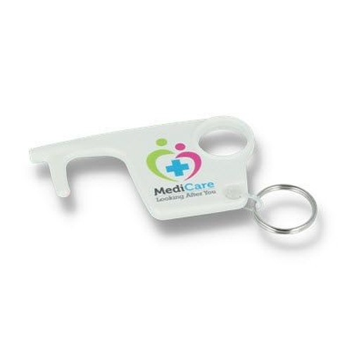 Made from 100% recycled plastic, comes on a keyring to avoid contact with surfaces. Digitally printed