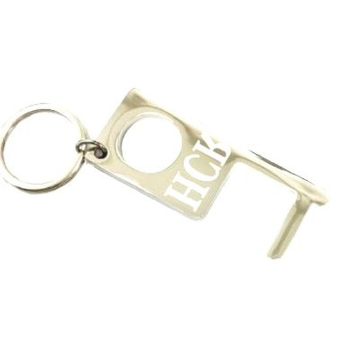 Hygiene safety hook keyring with a large finger hole, helps gain access or press buttons without using hands. Can be engraved to both sides